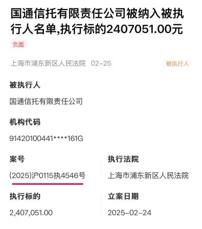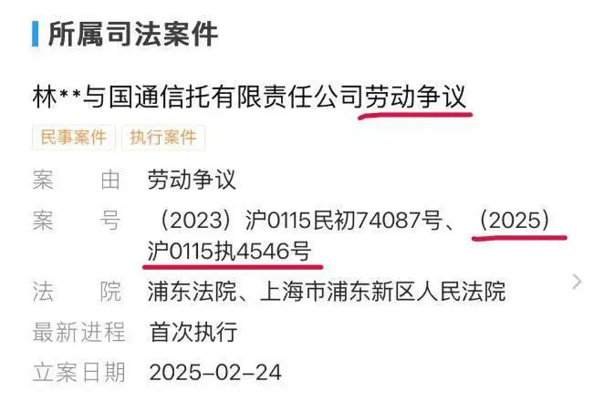 摘要:微信公众号“上海信托圈”爆料,国通信托有限责任公司(以下简称“国通信托”)涉及一林姓员工的劳动争议,案号为(2025)沪0115执4546号,执行标的高达240.7万元,国通信托因此被纳入被执行人名单。