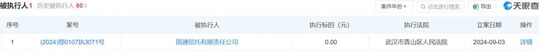 据天眼查法律诉讼信息显示,2024年9月3日,国通信托有限责任公司被武汉市青山区人民法院列为被执行人【案号:(2024)鄂0107执3071号】,执行标的0元。